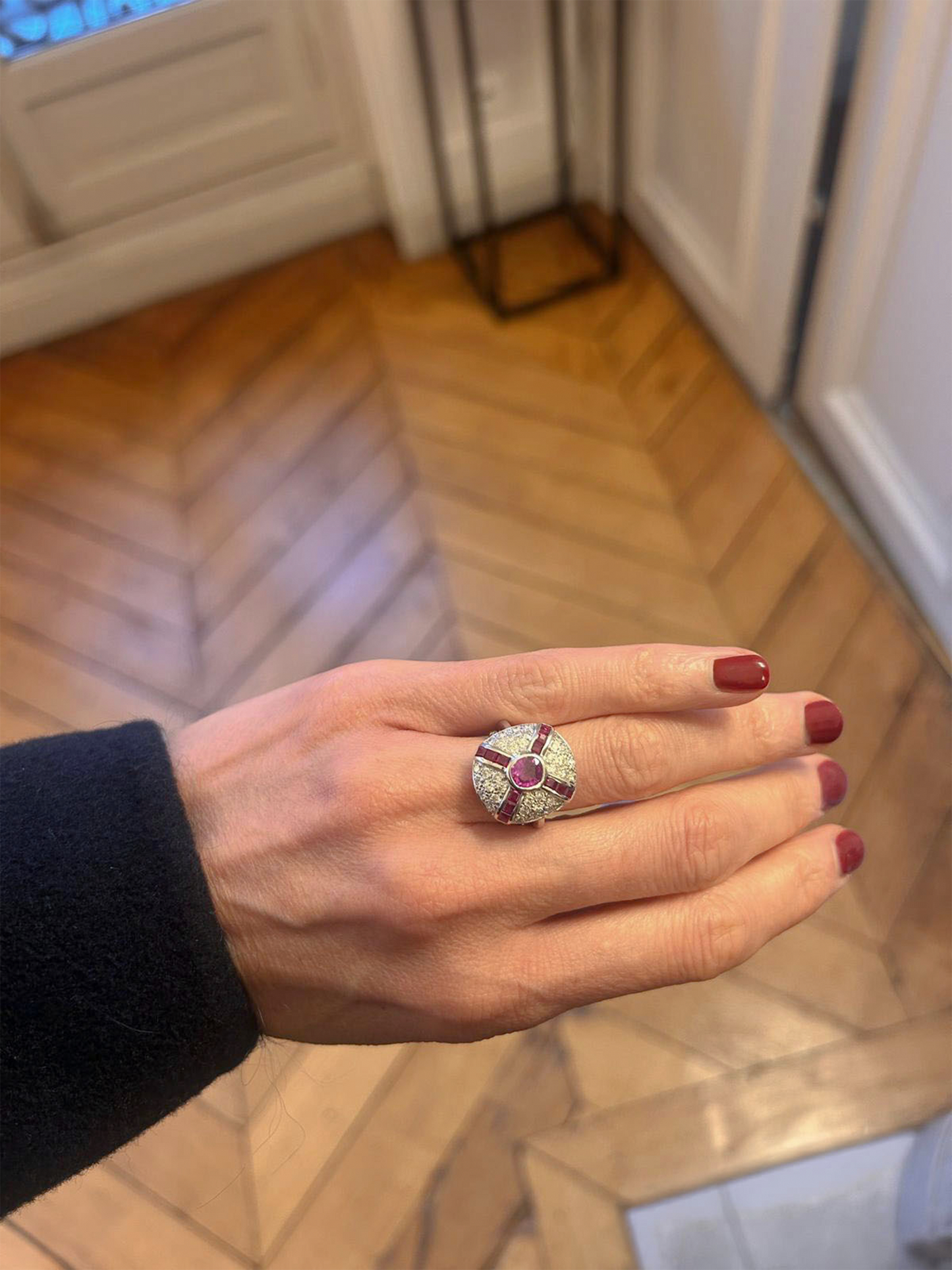 Bague lumineuse en or blanc 18k (750 millièmes) pavée de petits diamants naturels et de rubis naturels traités calibrés d'origine probable Sri Lanka. Joli rubis central de forme ovale d'env. 0,60 ct.