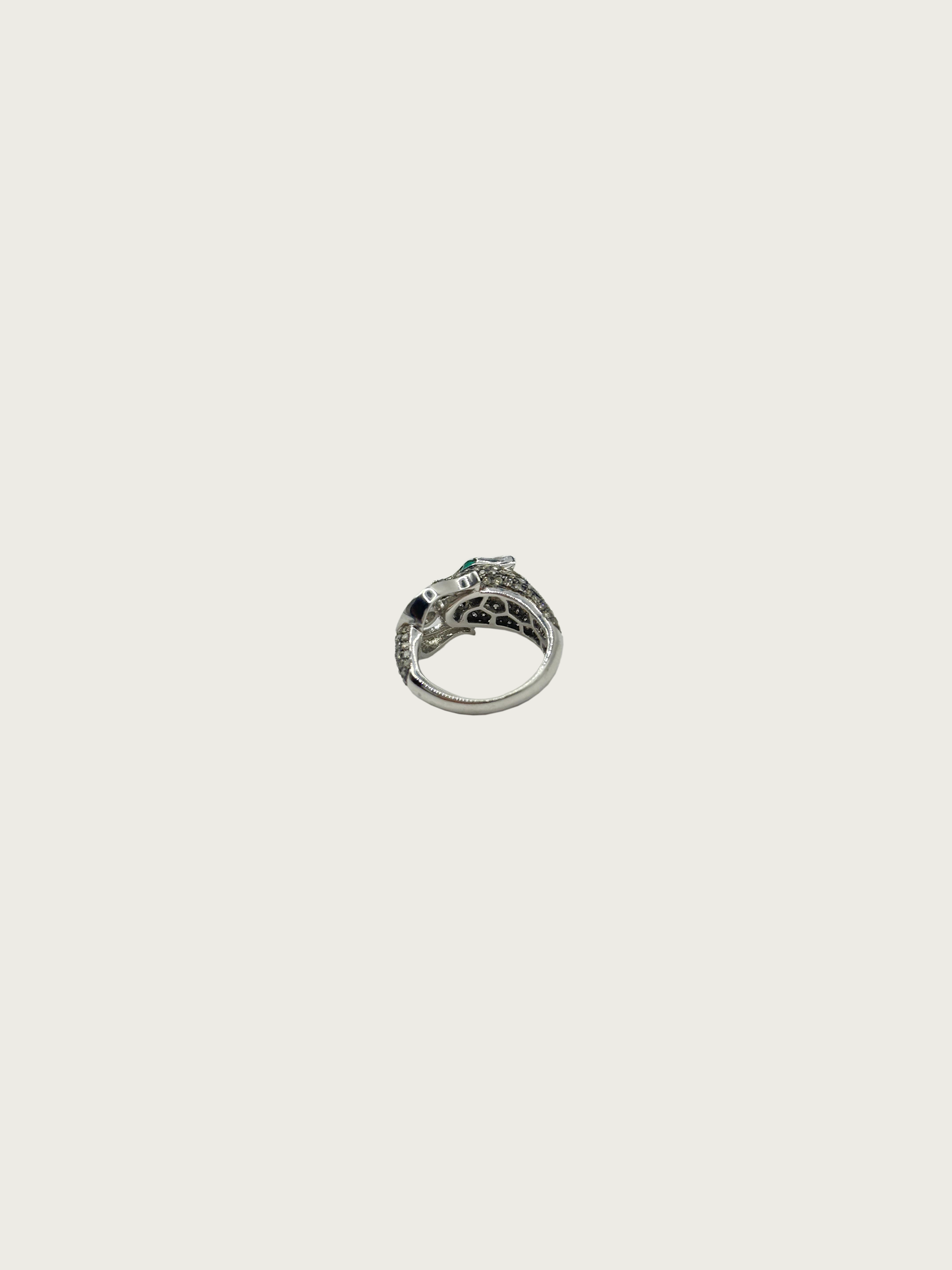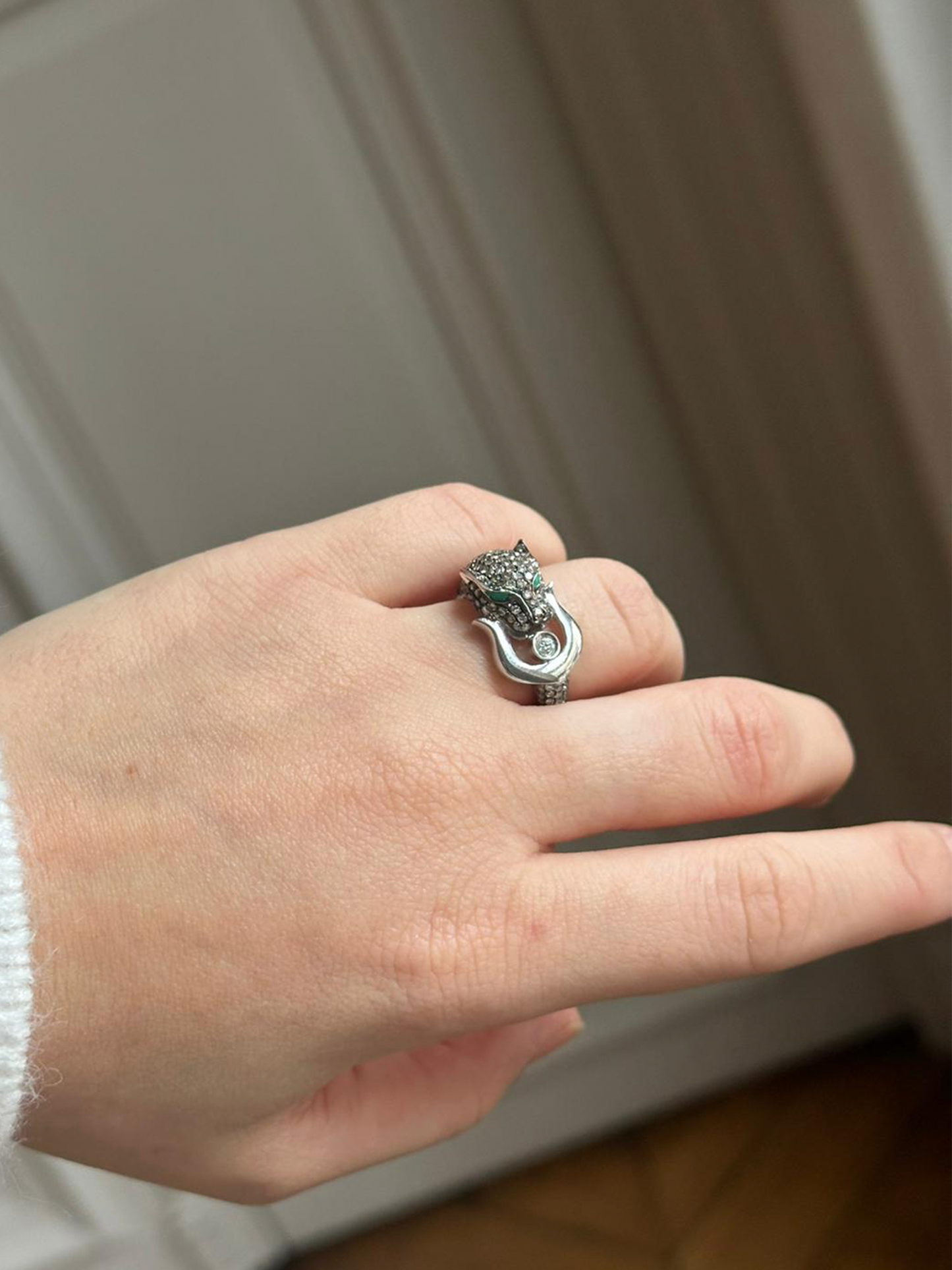 Bague en or blanc et or blanc noirci 18k (750 millièmes) figurant une tête de panthère pavée de petits diamants naturels aux yeux en émeraudes. Très jolis détails et belles finitions.