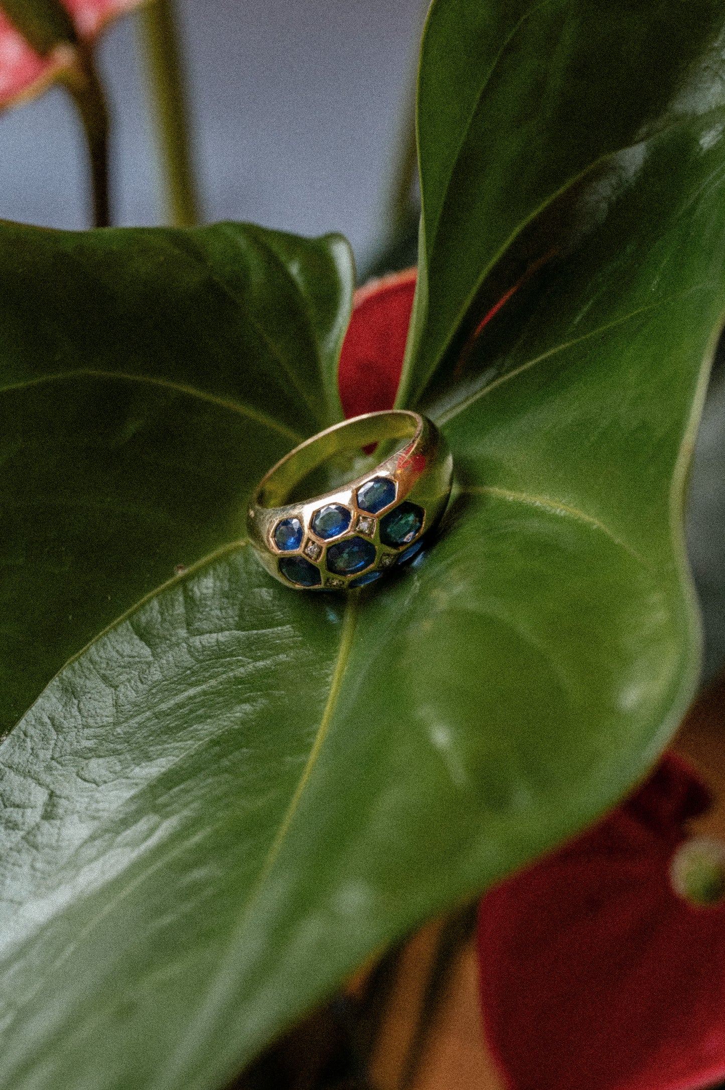 Bague boule en or jaune 14k (585 millièmes) décorées de neuf saphirs bleus naturels chauffés de forme ovale sertis dans des alvéoles en nid d'abeilles illuminés de quatre petits diamants.