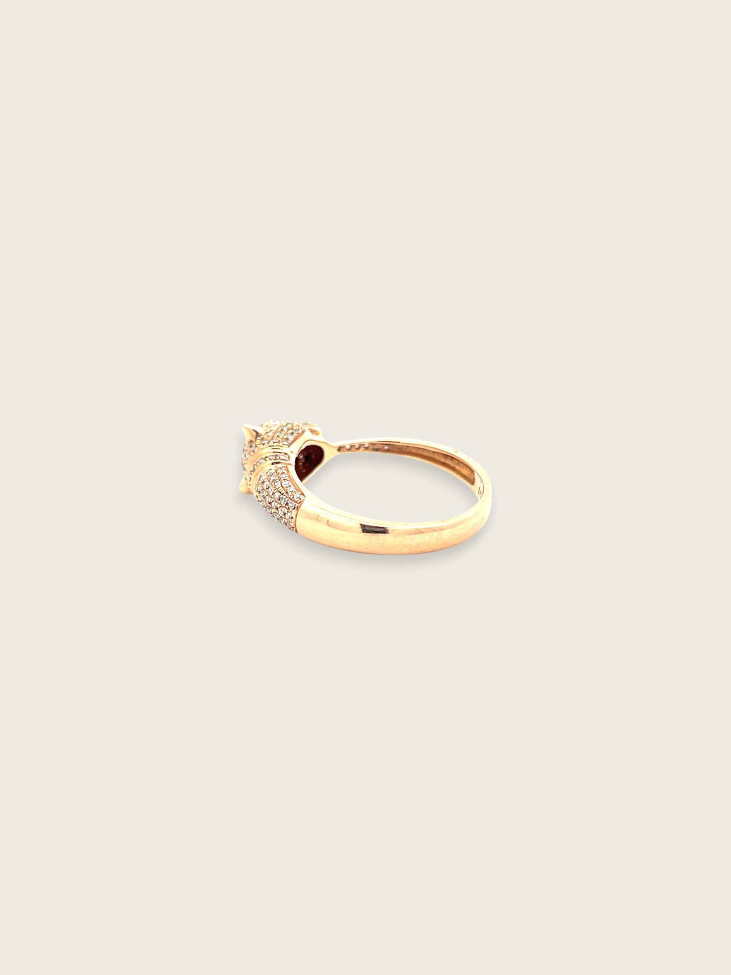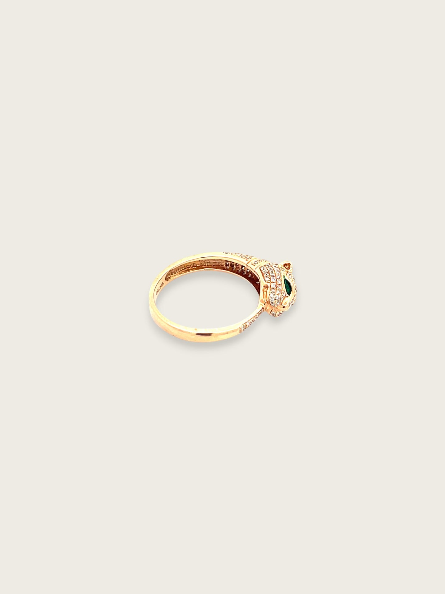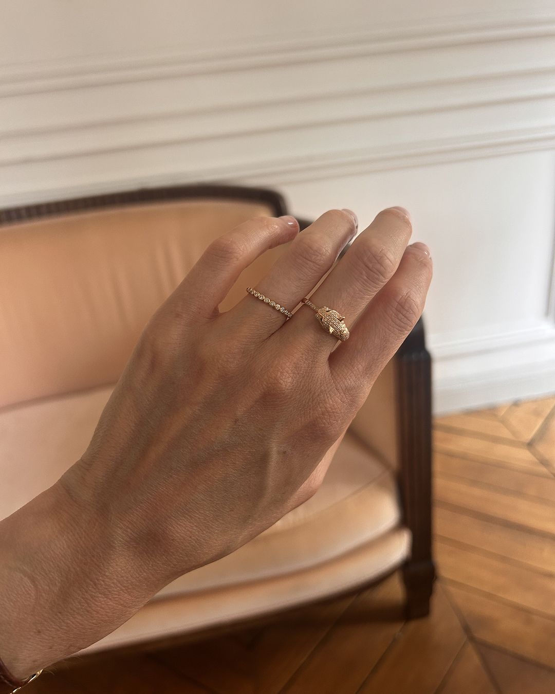 Fine bague Karkalis en or rose 18k (750 millièmes) figurant un enroulement de panthère à la tête et bout de queue pavées de fins diamants naturels et aux yeux émaillés de vert transparent. Travail d'une grande finesse datant de 2008.