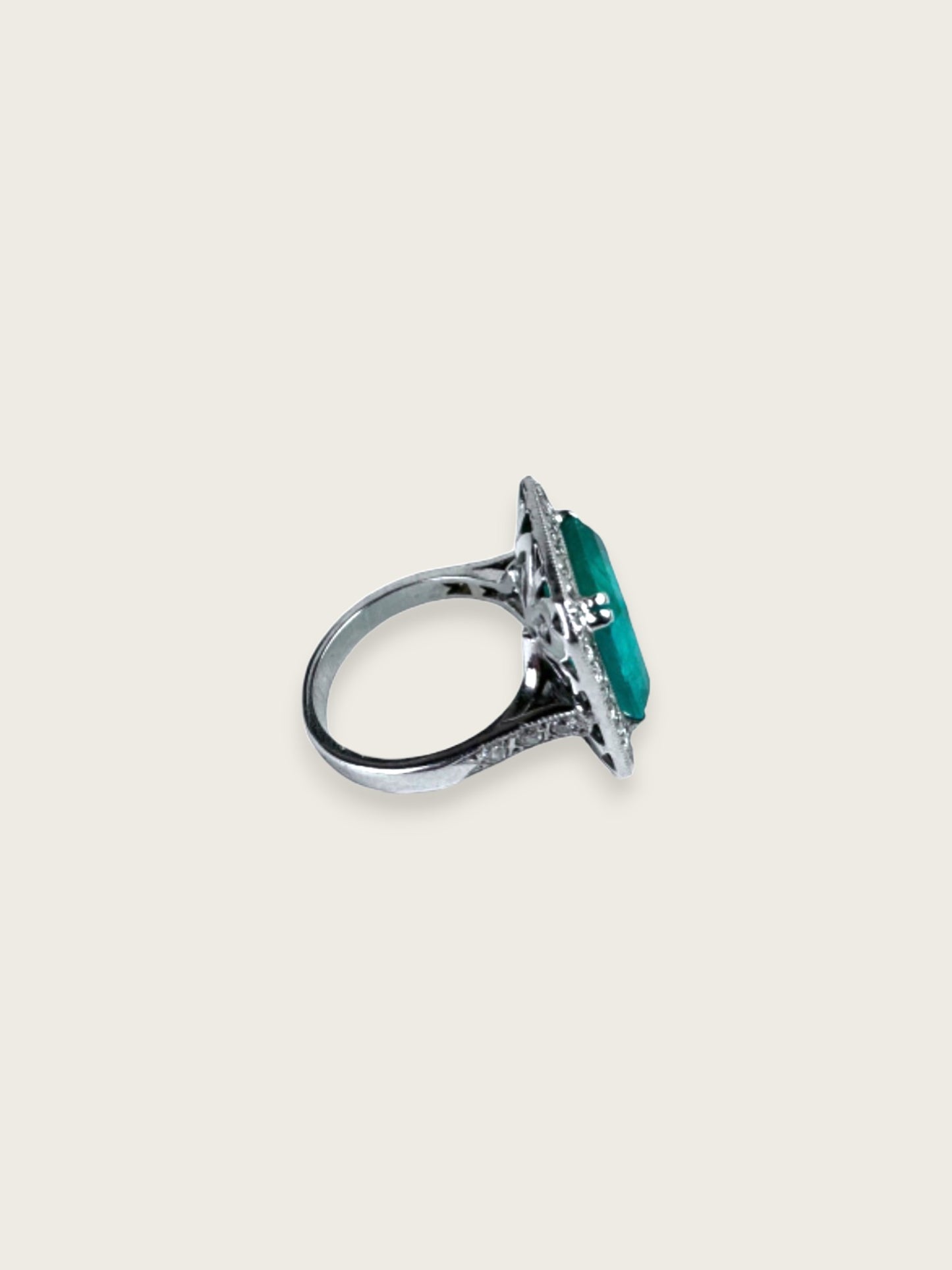 Bague en or blanc 18k (750 millièmes) présentant dans un entourage de diamants ronds brillants anciens une émeraude de Colombie d’env. 4,7 ct. de taille rectangulaire à pans coupés.