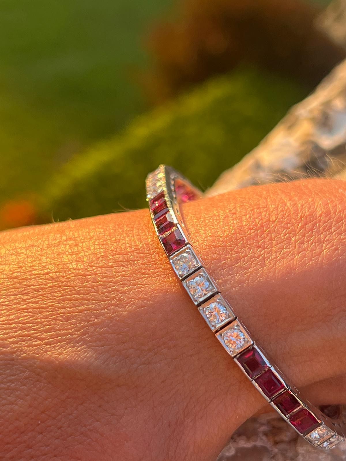 Superbe bracelet tennis en platine et or blanc 18k et 14k (750 millièmes et 585 millièmes) alternant env. 5,5 ct. de très beaux rubis transparents naturels thaïlandais principalement non chauffés et env. 2,5 ct. de diamants ronds brillants anciens de très belle qualité.