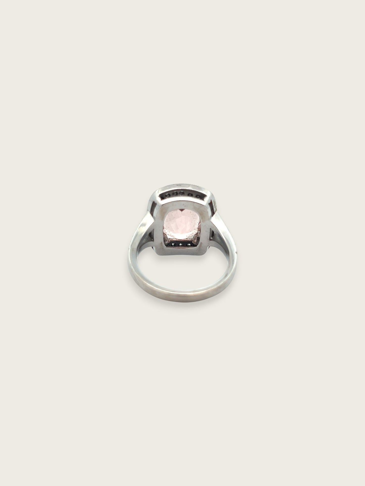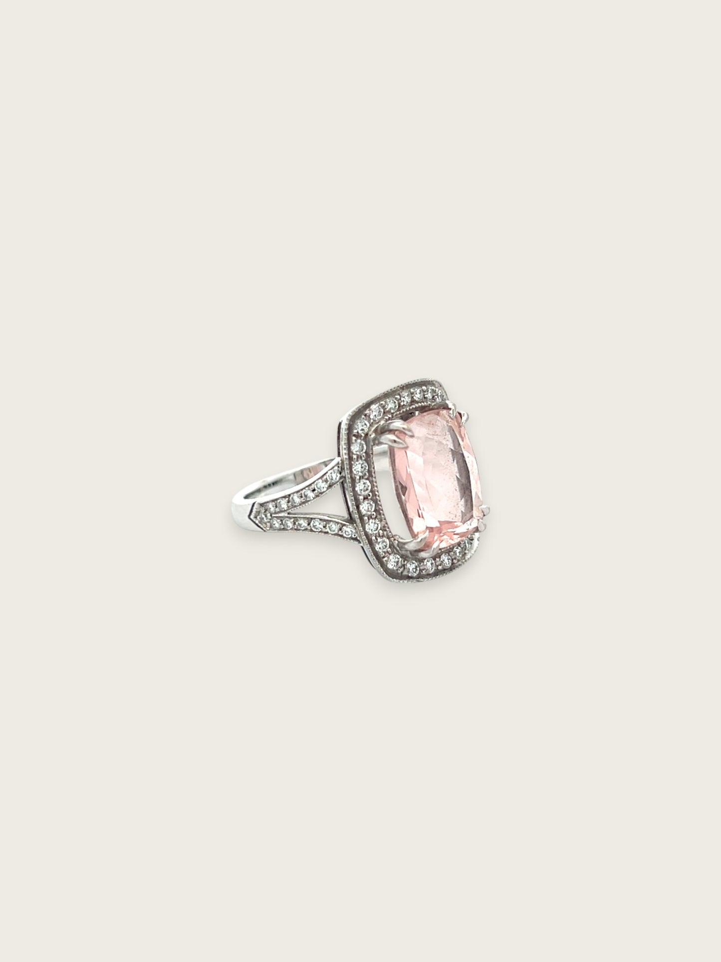 Ajouter poinçon de garantie Nadine BAUDHUIN Bague en or blanc 18k (750 millièmes) présentant dans un entourage de 0,38 ct. de diamants taille rond brillant une très belle morganite de 4,02 ct. d'un rose très doux taille coussin rectangulaire.