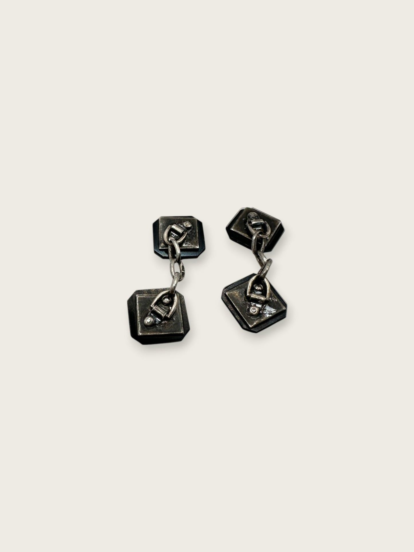 Paire de boutons de manchettes en argent présentant des carrés à pans coupés centrés argent guilloché au contour d'onyx en excellent état. Travail du début du XXe siècle.