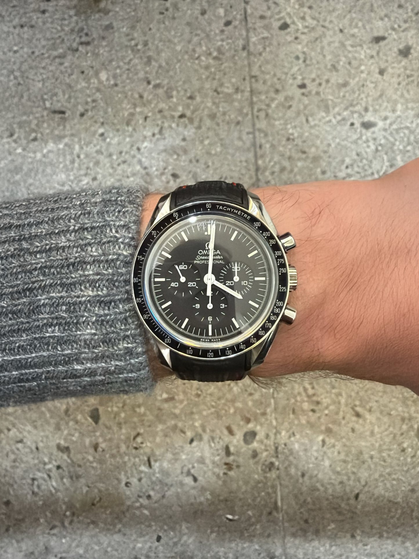 Cet exemplaire de 42 mm en acier inoxydable s’inspire directement de la Speedmaster de 4e génération portée sur la Lune. Son boîtier asymétrique accueille un cadran blanc laqué à étage, sublimé par des index appliqués, le logo OMEGA et des aiguilles emblématiques « Moonwatch ». La lunette noire en aluminium anodisé, dotée du célèbre point au-dessus du 90, complète son esthétique immédiatement reconnaissable.