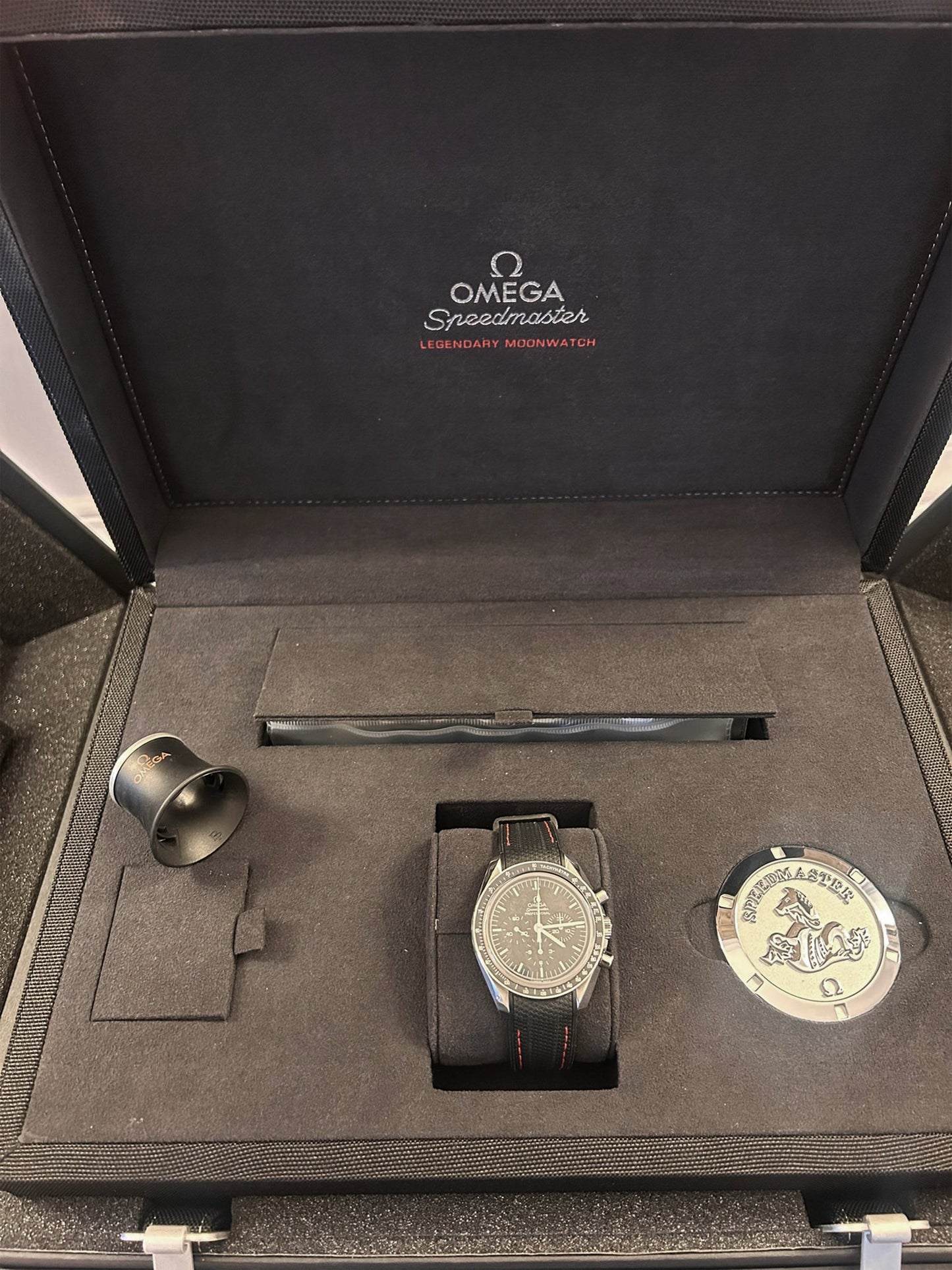 La montre est animée par le calibre OMEGA Co-Axial Master Chronometer 3861, à remontage manuel, visible à travers le fond saphir, et offre une précision et une fiabilité de très haut niveau. Elle est accompagnée de son coffret complet d’origine, faisant de cet ensemble une pièce de collection particulièrement recherchée.