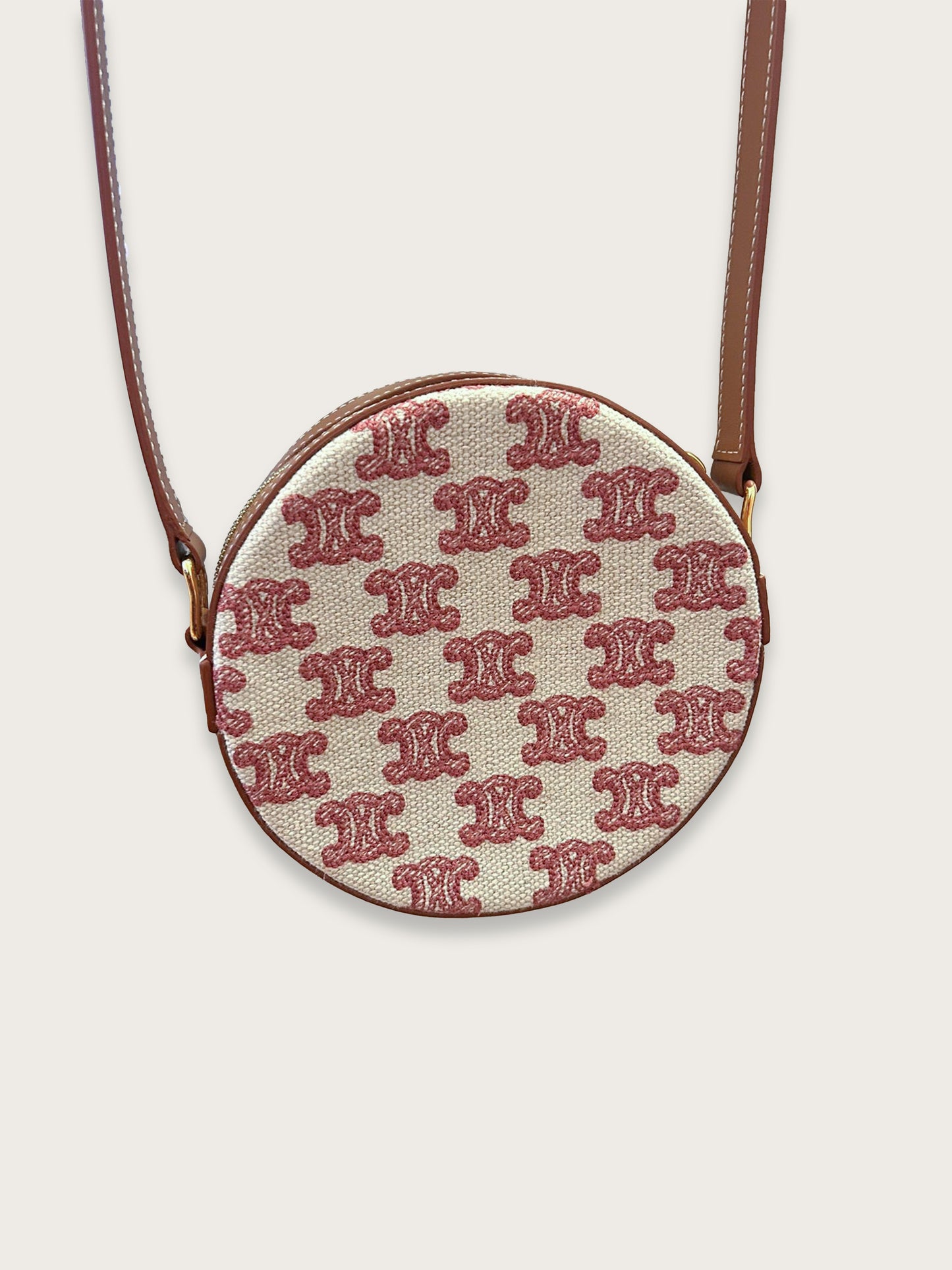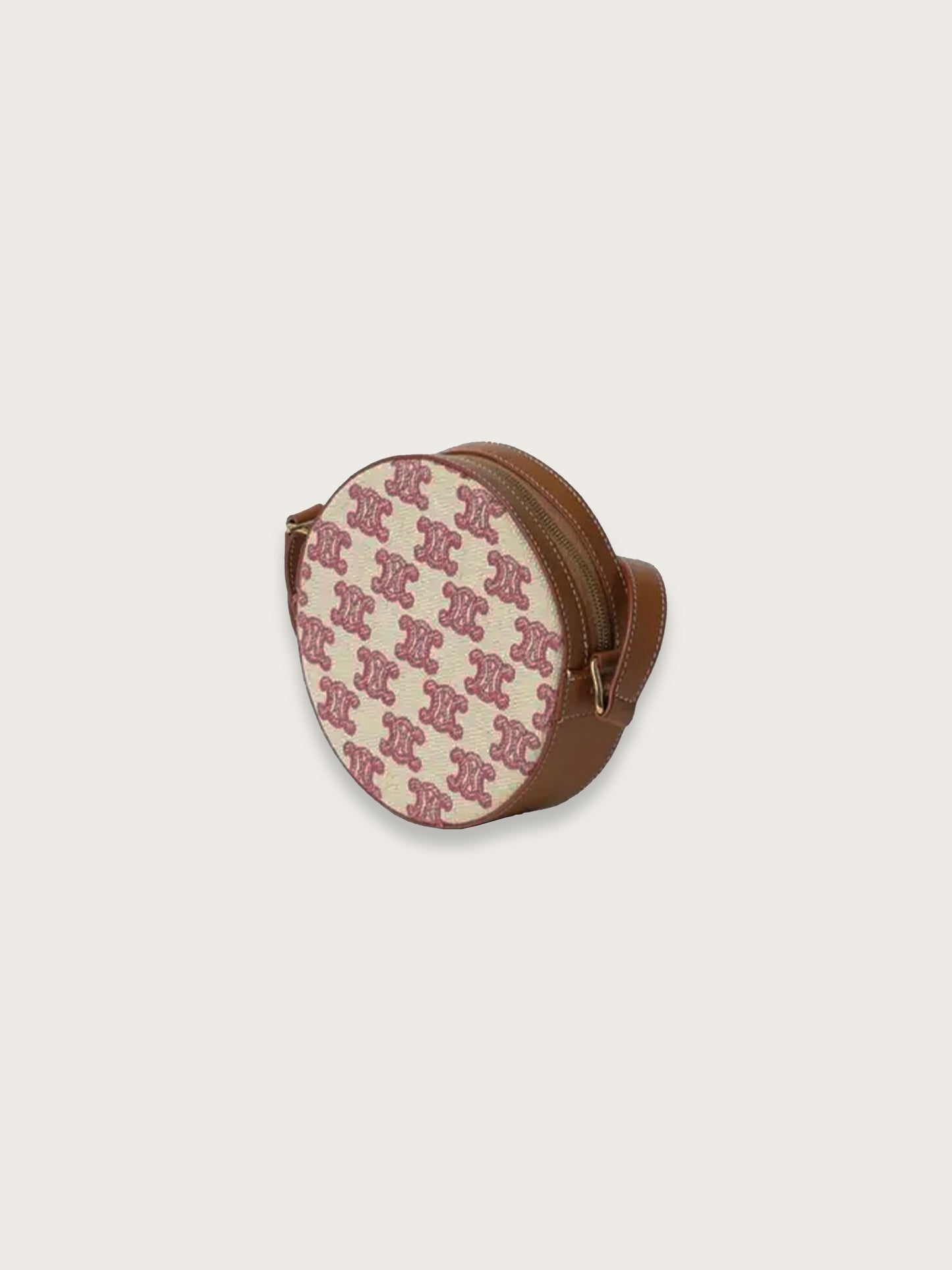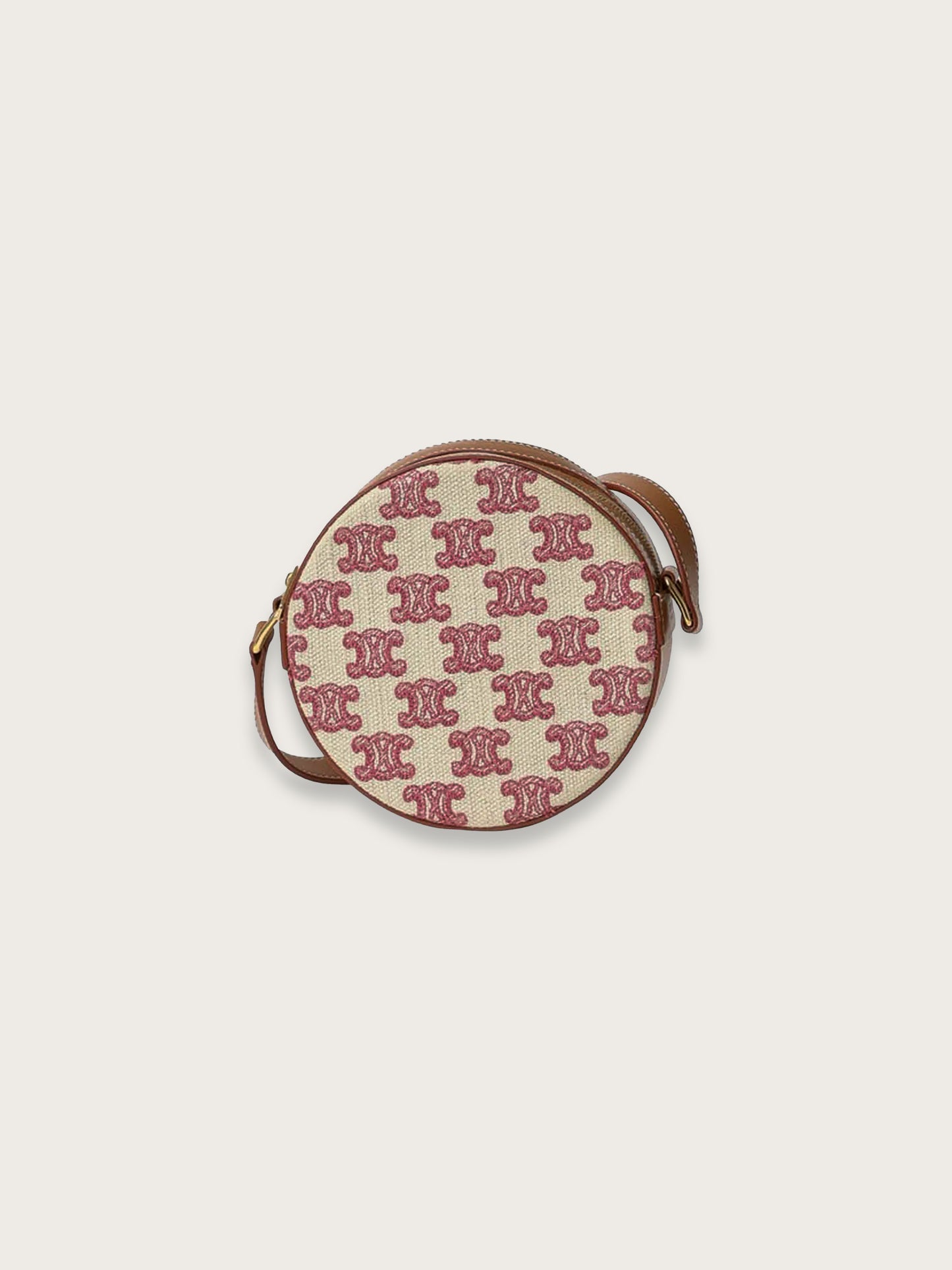 Icône contemporaine de la Maison CELINE, le sac rond Triomphe séduit par son élégance minimaliste et son format compact très désirable. Confectionné en toile Triomphe rose, rehaussée de cuir marron et d’une quincaillerie dorée brillante, il incarne l’esthétique parisienne chère à la marque.