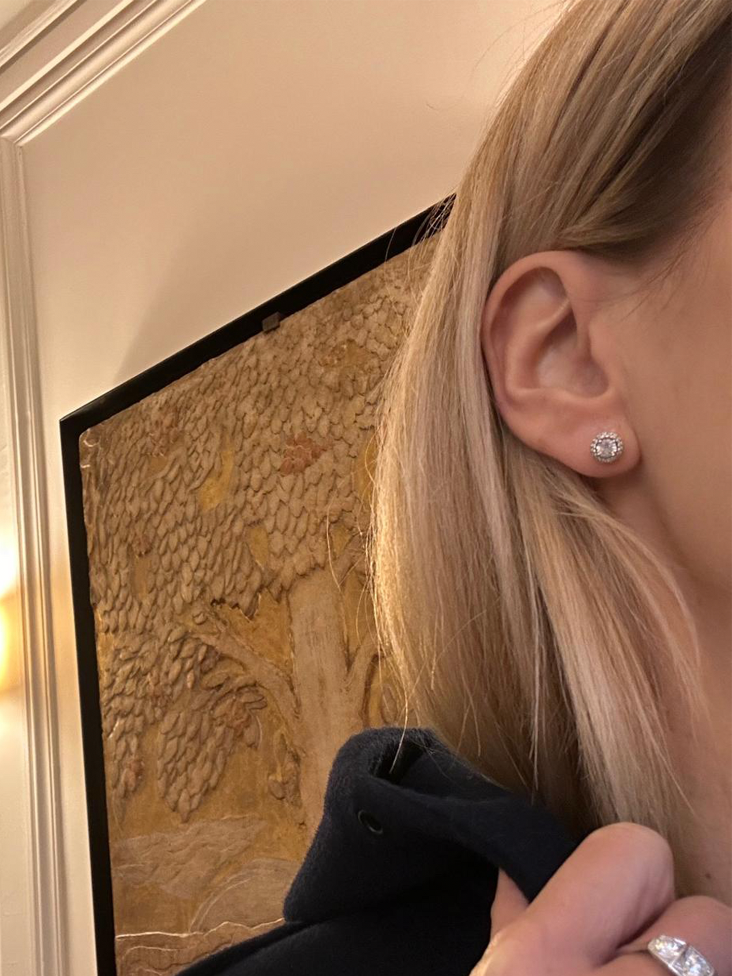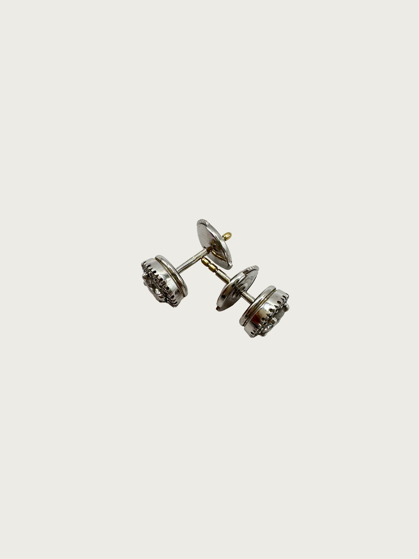 Puces d'oreilles en or blanc 18k (750 millièmes) ornées d'un diamant central et d'une entourage de petits diamants.