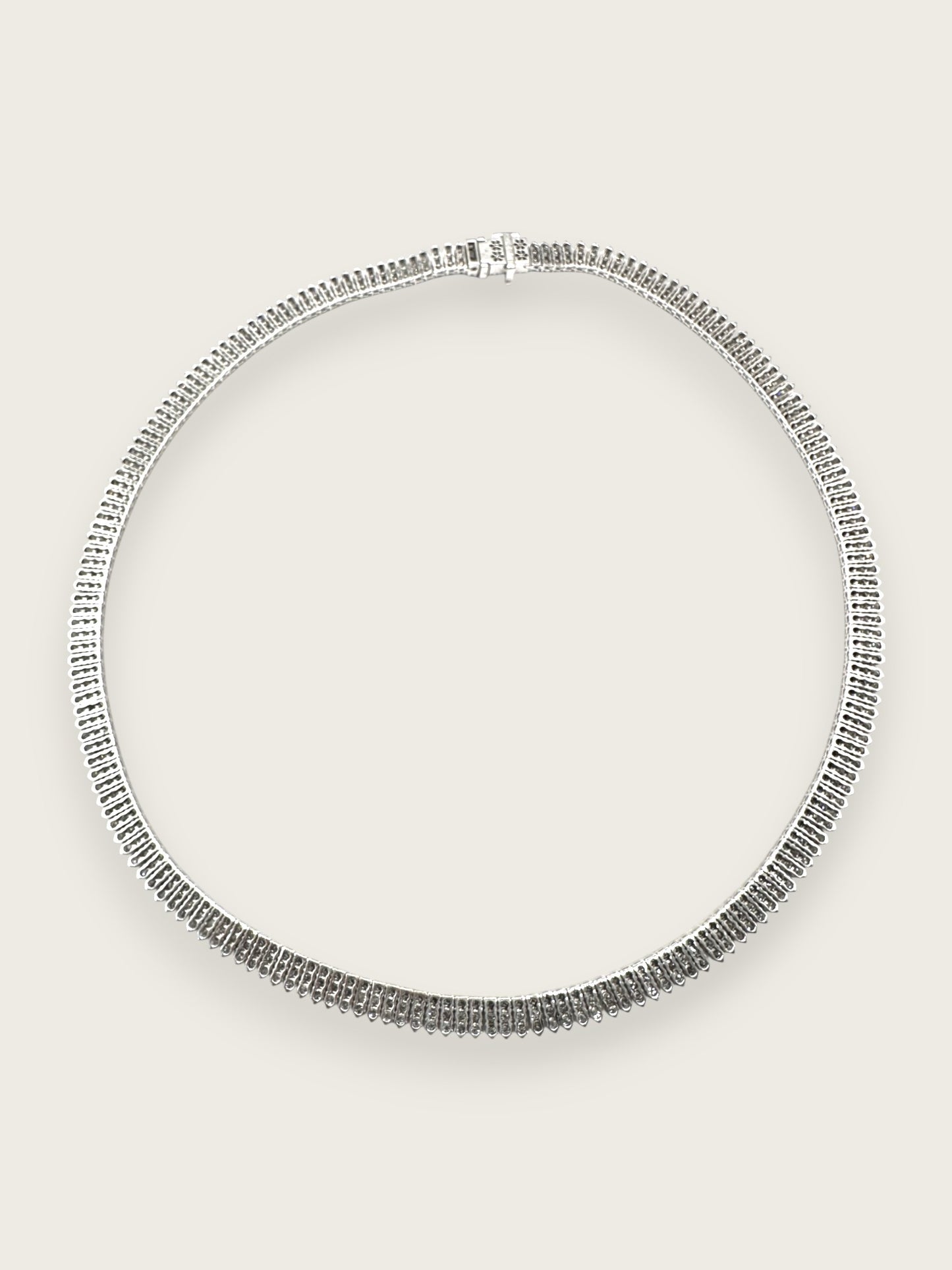 Collier rivière de diamants en or blanc 18k (750 millièmes) composée de lamelles chacune ornée de diamants ronds brillants pour env. 4,8 ct. au total.
