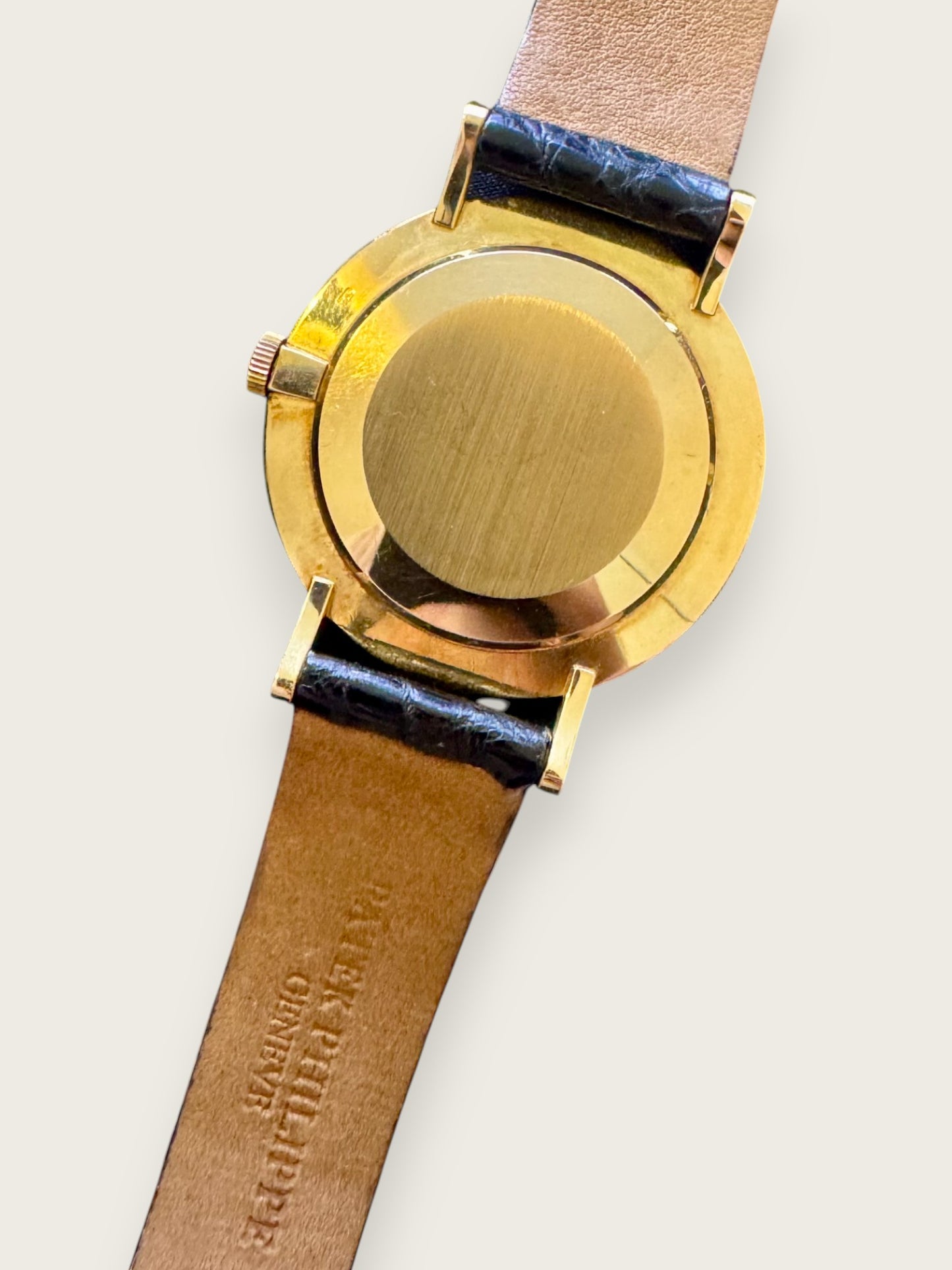 Bracelet : Cuir d’alligator noir signé Patek Philippe. Fonctions : Heures, minutes