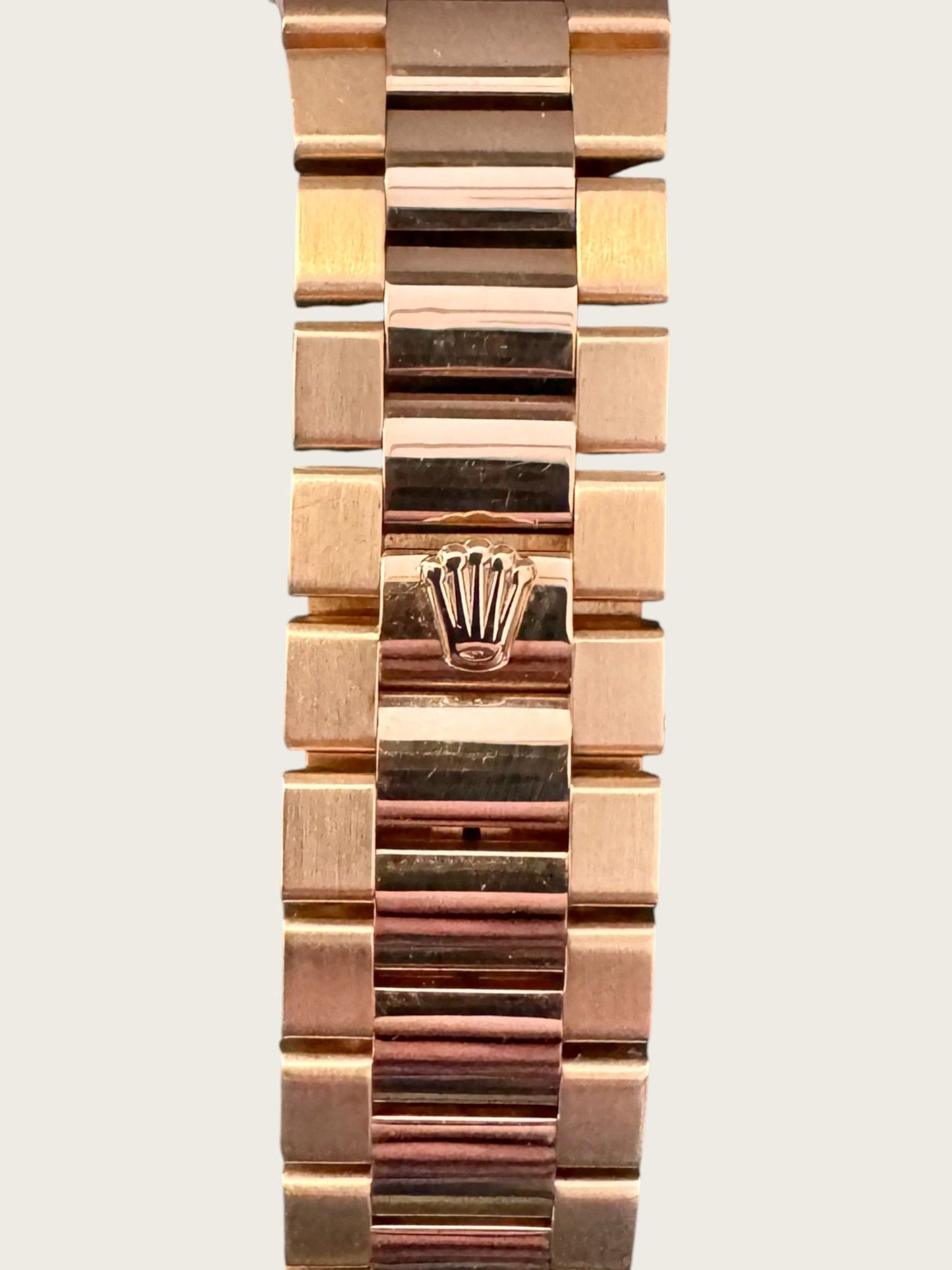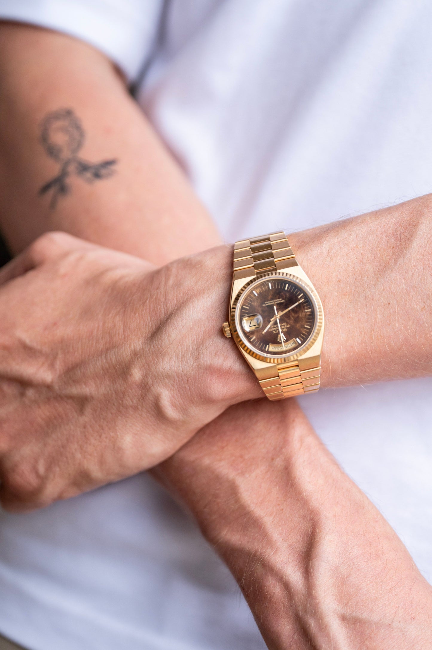 En voici un exemplaire encore plus rare : une Daydate à pile et avec un cadran en bois. Oui cette montre à pile est désirable.